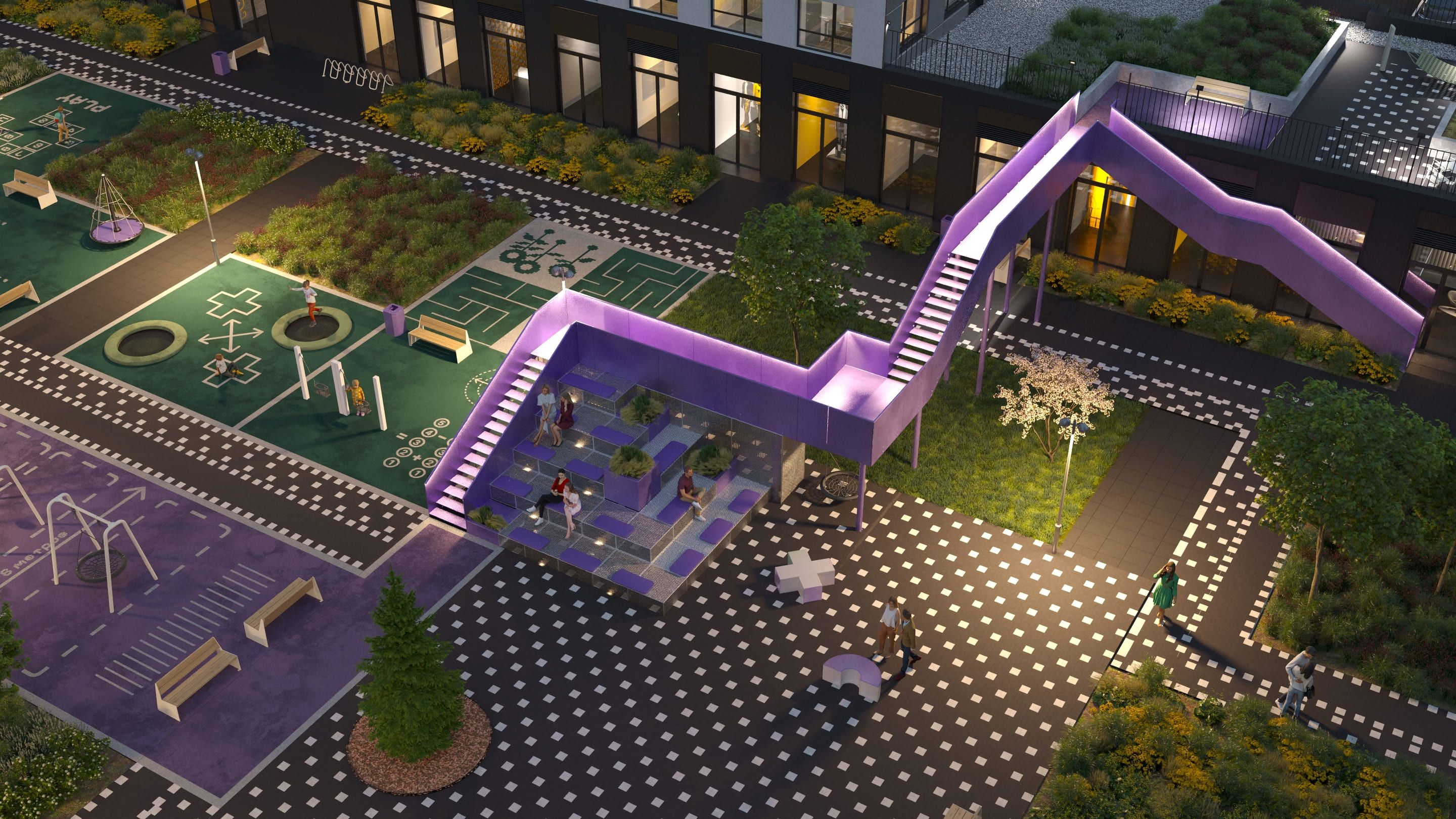 Территория благоустройства объединена для всех трёх очередей — это даёт целостный облик и функциональность будущему комплексу. Яркая «змейка»-маршрут проходит через весь двор, соединяя зоны активности. МАФы выполнены в пиксельной стилистике, поддерживая концепцию проекта.